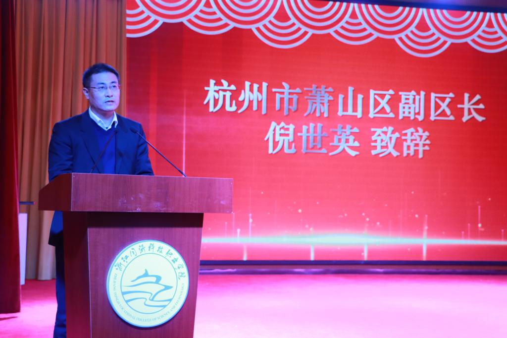 杭州市萧山区区域经济促进会会长章金顺致辞。章金顺表示,促进会将从三个方面着手做好产业学院工作:一是推进产教融合培养人才,推动高校与行业企业深度合作培养人才,着力提高学生的综合素质和适应能力;二是扩大校企合作科研的溢出效应,从理论、实践、应用三个维度,打造校企联合培养人才平台;三是构建校内实践教学基地与校外实习实训基地相联动的实践教学平台,建成一批共享型、区域化的产学研合作、协同育人实践平台,促进校企间合作育人、合作发展。