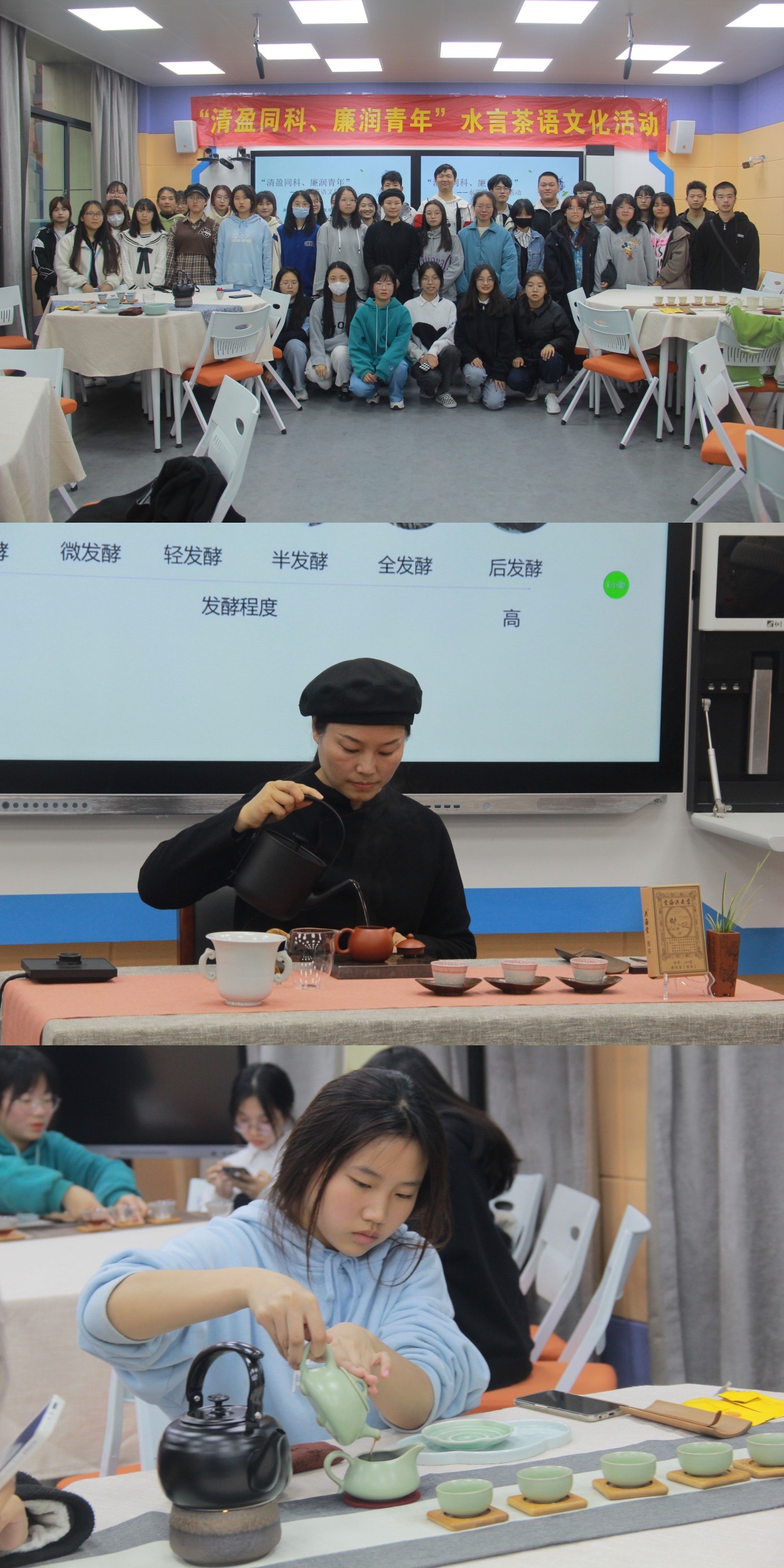 为贯彻全省深化清廉学校建设工作推进会精神,扎实推进“清廉同科”建设,围绕清廉学校建设的目标,学校集中开展“清廉教育月”活动。纪委办和经信学院党总支于11月17日下午共同举办了“清盈同科,廉润青年”水言茶语文化活动。学校纪委办负责人、部分二级学院党总支负责人、各学院师生代表参加了此次活动,