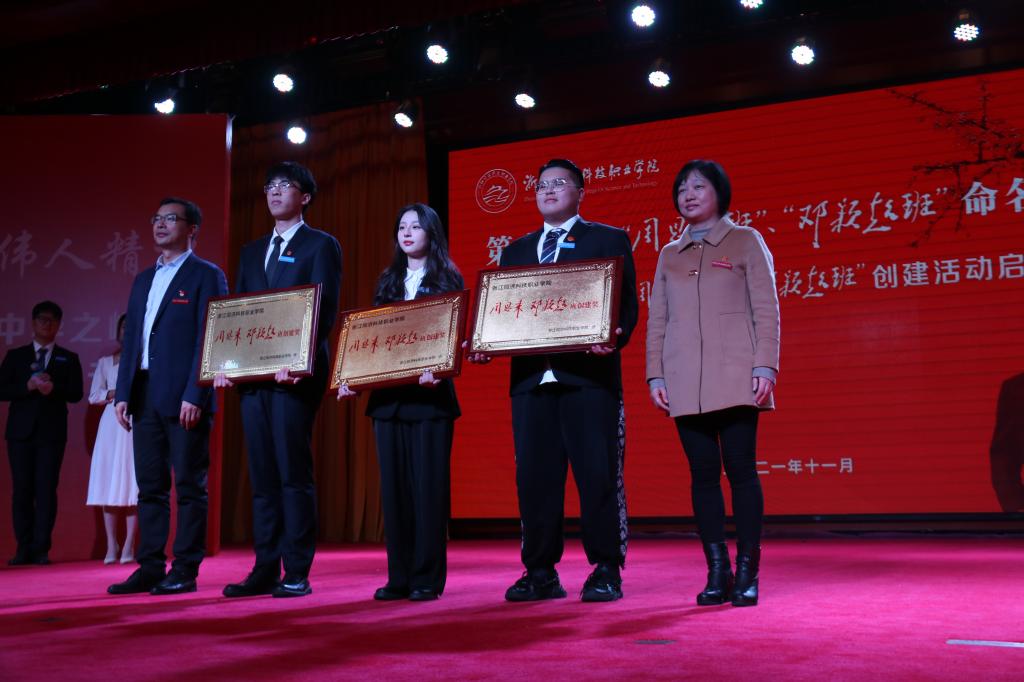仪式开始,在庄严的国歌声后,全体人员向周恩来、邓颖超像深深鞠躬表达缅怀之情。紧接着与会人员通过视频,共同回顾了学校“周恩来班”“邓颖超班”十三年的创建历程,校长梁国钱宣读了命名文件。随后,学校党委书记江影、校长梁国钱为第十三届“周恩来班”“邓颖超班”授铜牌;校党委副书记、副校长吴宏平,校党委委员、副校长沈自力为第十三届“周恩来班”“邓颖超班”赠像;校党委委员、纪委书记应芬,校党委委员、副校长朱兆平为第十三届“周恩来班”“邓颖超班”赠纪念章;校党委委员、组织部部长吴玲洪,校党委委员、宣传部部长吴敏启为第十三届“周恩来班”“邓颖超班”创建奖班级授牌。
