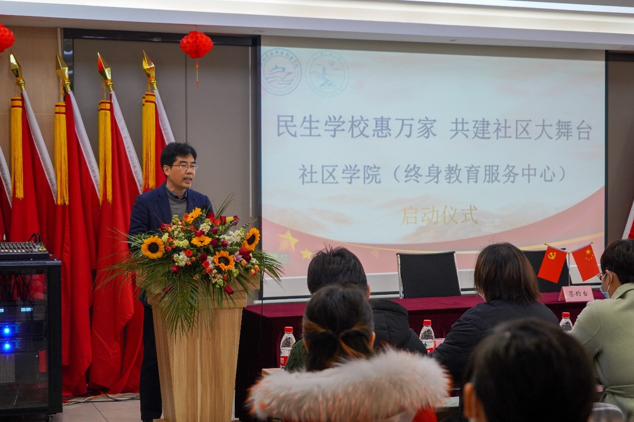在揭牌仪式上,姜伟副校长对社区学院的成立表示祝贺,同时指出,建设社区学院是我校贯彻落实党的十九大报告和《职业教育提质培优行动计划(2020—2023年)》有关要求的一项重要举措,也是我校在省“双高”建设中的一项重要工作任务,社区学院既要办好、办实,也要宣传好、报道好。要进一步整合学校优质资源,根据居民需求开设更多课程,将社区学院办精办特。要制定好周密的工作方案,尤其是在目前疫情防控常态化的情况下更要确保安全。