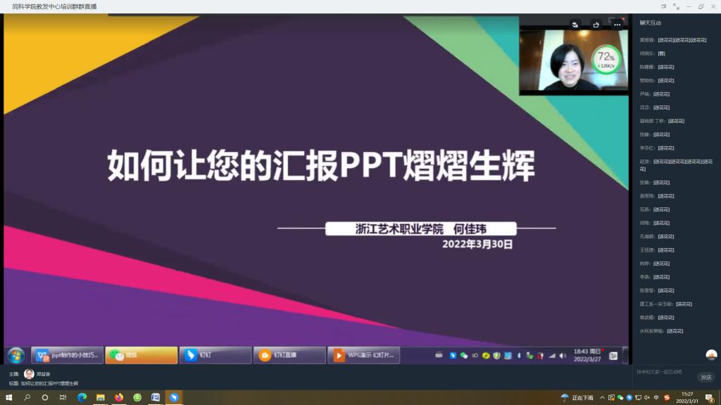 首场活动于3月30日下午举行。中心邀请浙江艺术职业学院设计学院副院长何佳玮副教授作“如何让您的汇报PPT熠熠生辉”专题讲座,讲座采用线上直播的形式举行,近200名教职工参加了此次在线培训。
