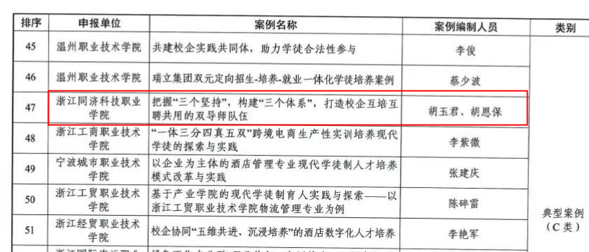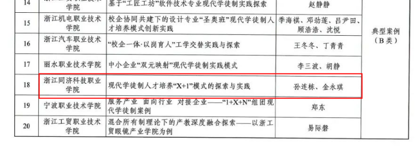 近日,浙江省中华职业教育社会同省教育厅、省人力资源和社会保障厅公布了2021年浙江省学徒制典型案例评选结果,全省共入选175项案例,其中高等职业院校60项,我校机电学院孙连栋、金永琪撰写的《现代学徒制人才培养“X+1”模式的探索与实践》,人事处胡玉君、胡恩保撰写的《把握“三个坚持”、构建“三个体系”,打造校企互培互聘共用的双导师队伍》两个案例成功入选。