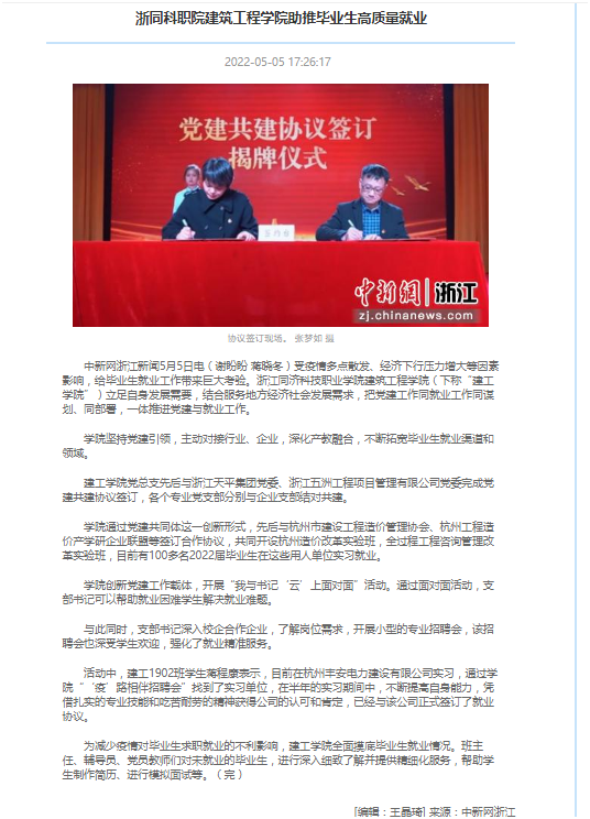 2022年5月5日中国新闻网以《浙同科职院建筑工程学院助推毕业生高质量就业》为题,报道建工学院坚持党建引领,助推毕业生就业事迹。