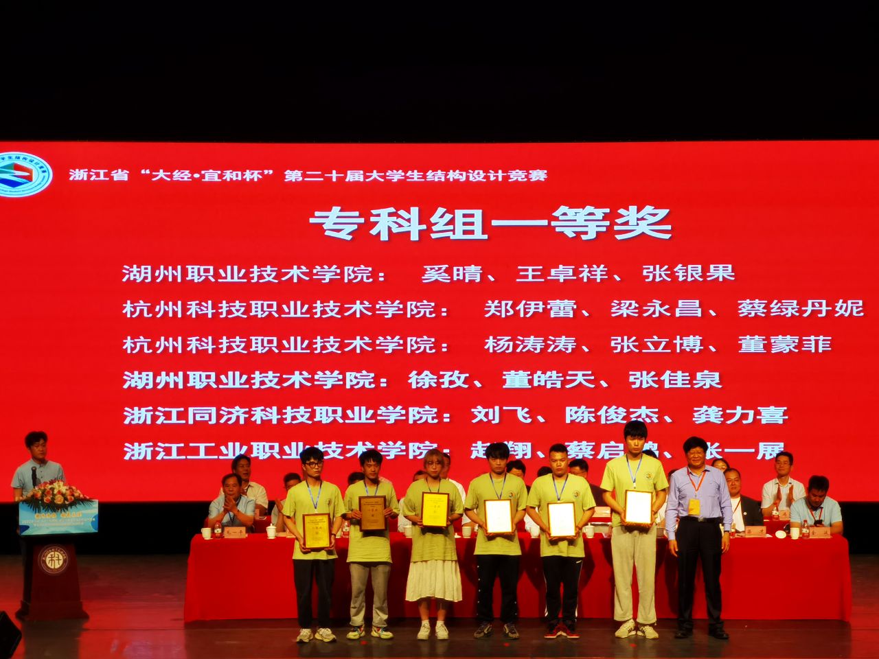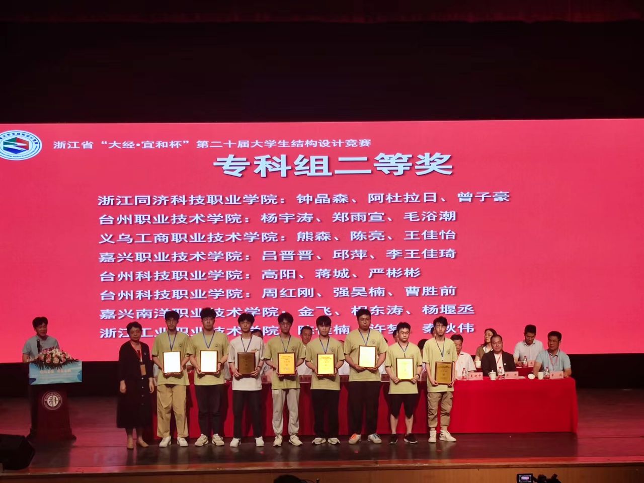 浙江省“大经·宜和杯”杯第二十届大学生结构设计竞赛暨全国大学生结构设计竞赛浙江省分区赛选拔赛于2022年6月5日在杭州科技职业技术学院落下帷幕,本次比赛共有来自全省48个高校的100支队伍500余位师生参加。经过三天紧张激烈的角逐,我校选派的代表队喜获一等、二等奖各一项,同时获得优秀组织奖。