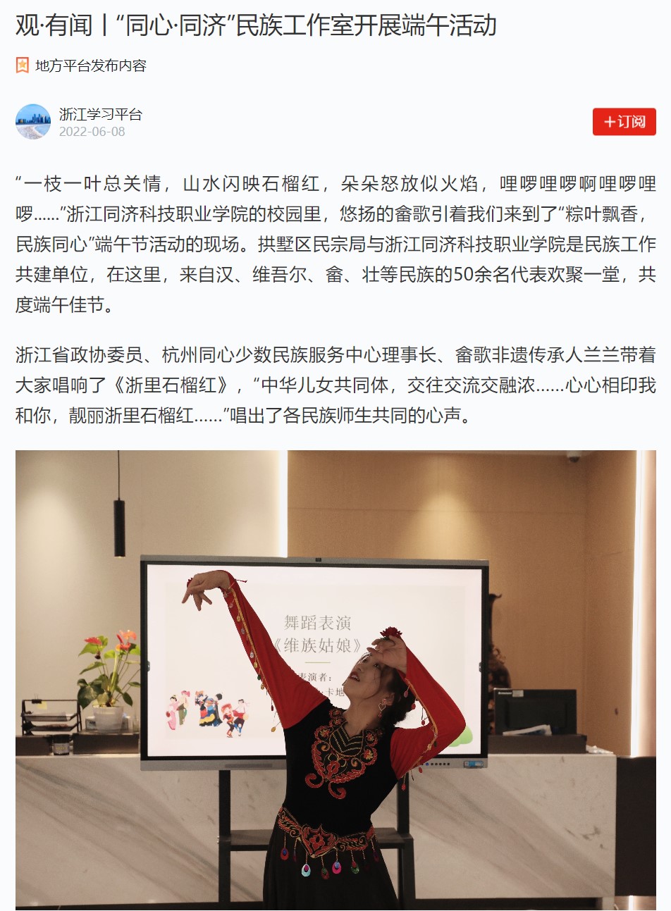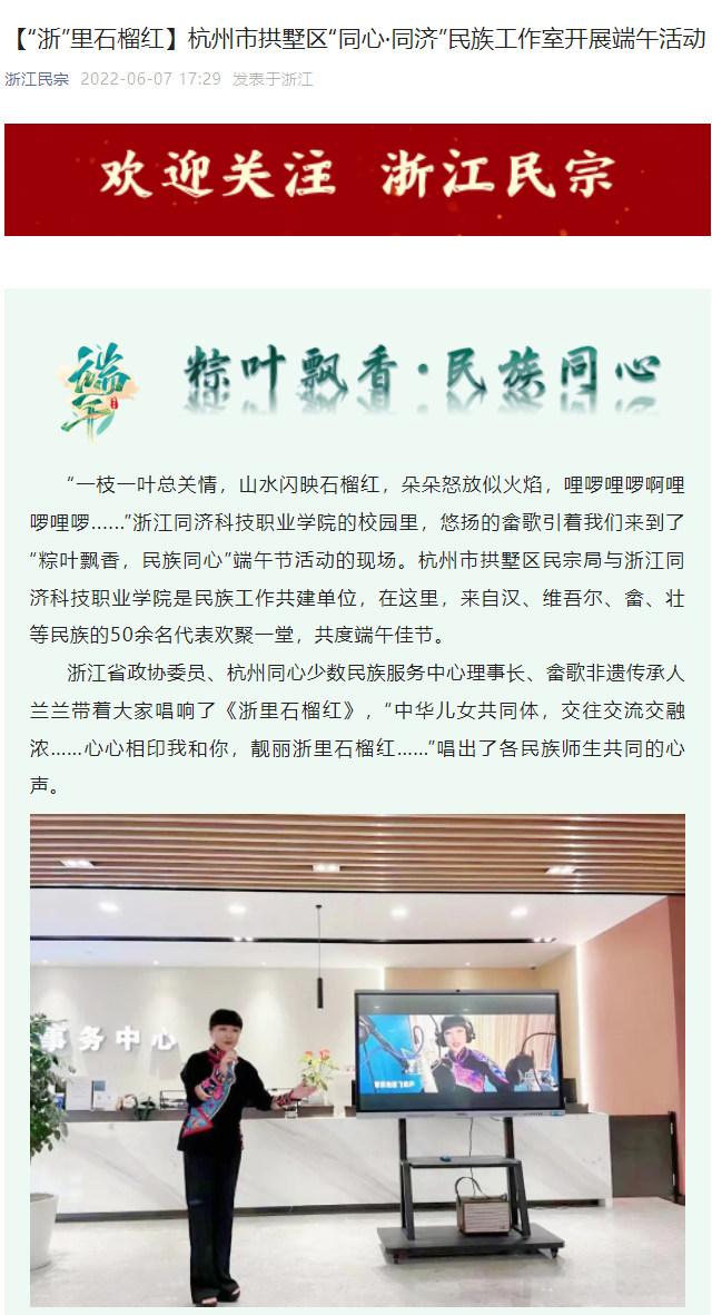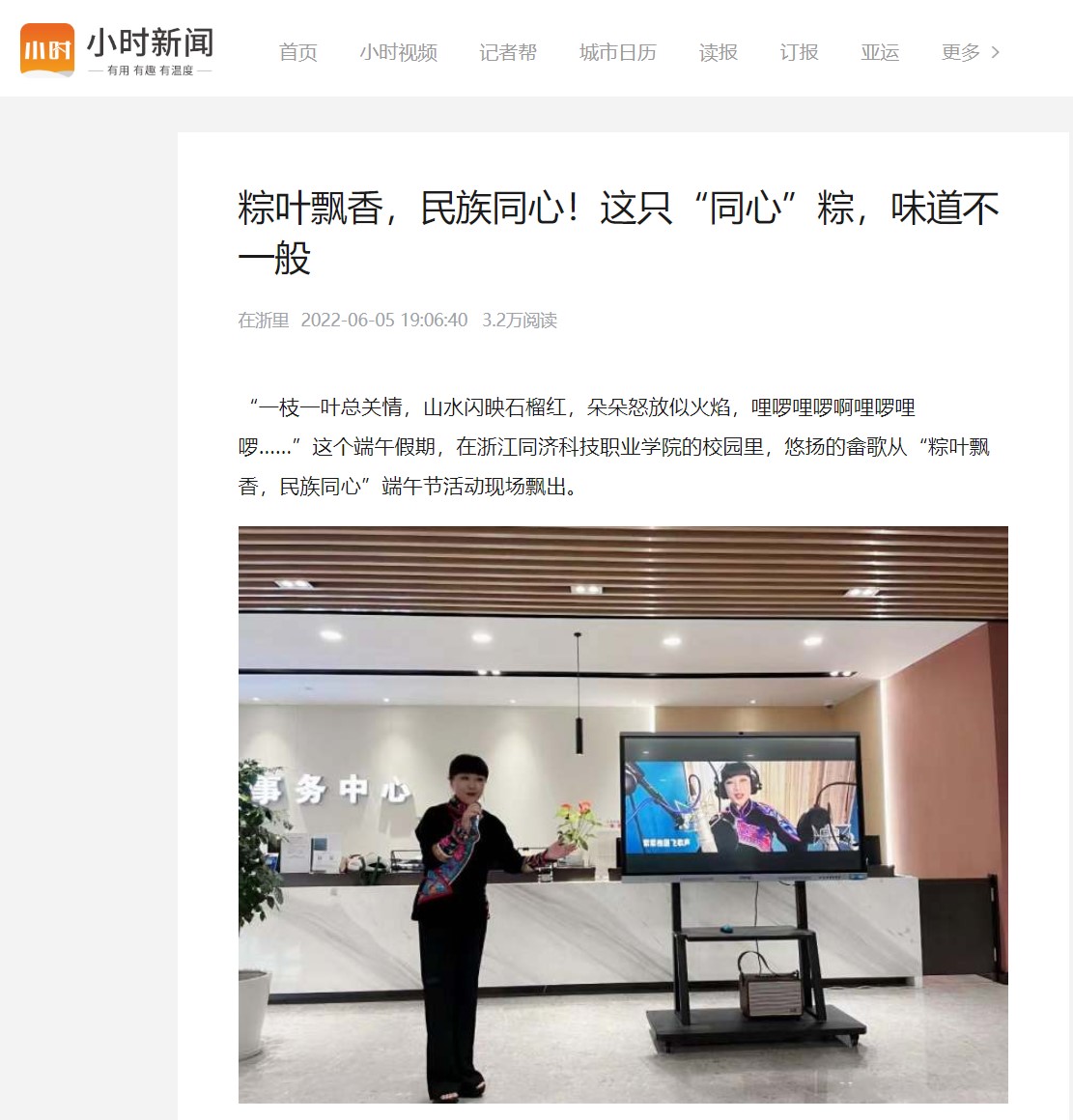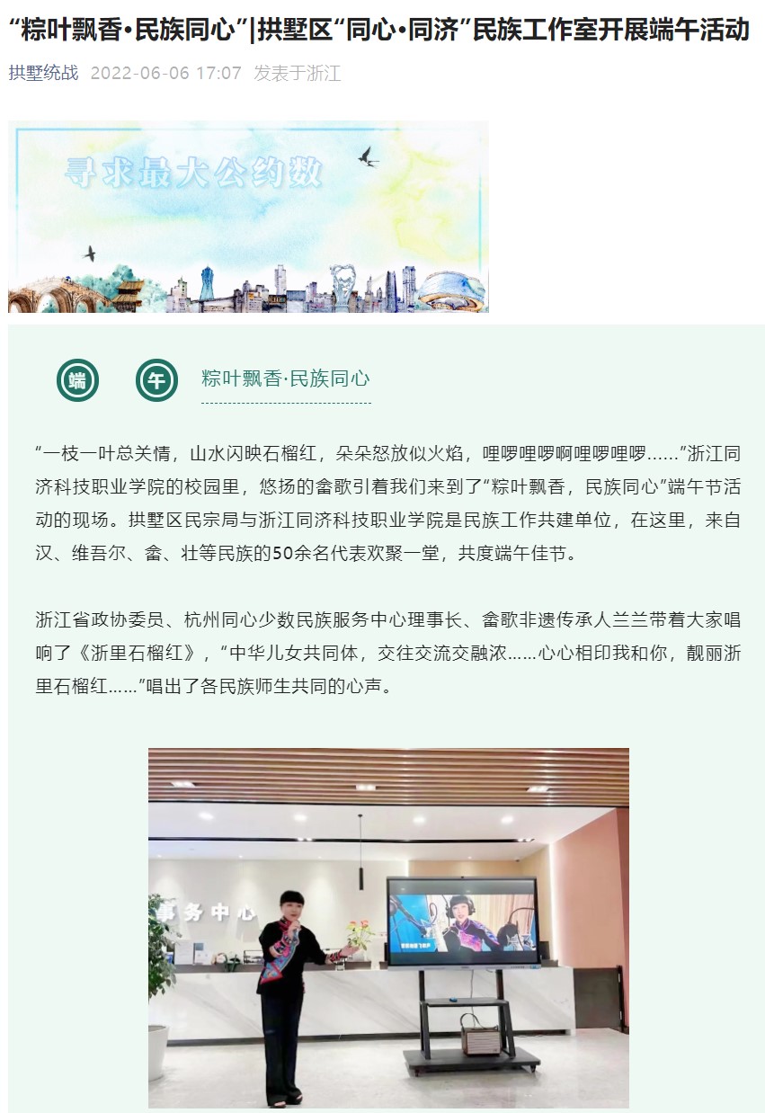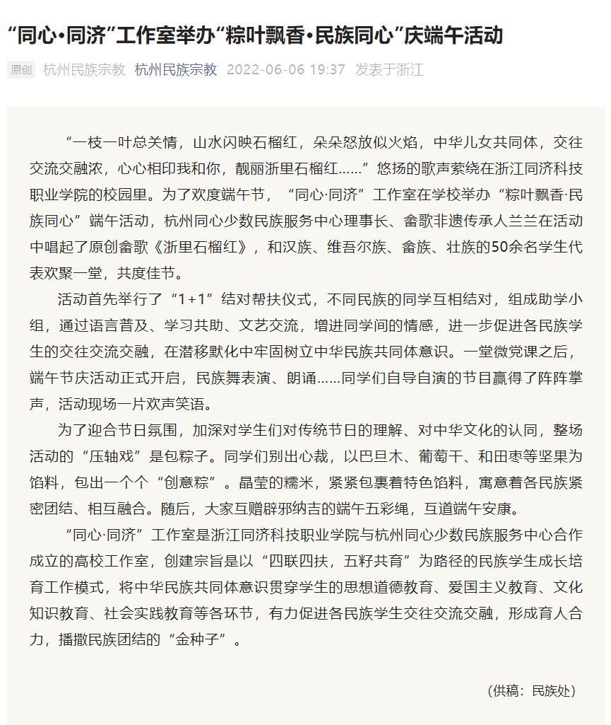 2022年6月6日至8日,学习强国浙江学习平台、浙江民宗、杭州民族宗教、拱墅统战等管理部门宣传平台及钱江晚报等社会媒体,分别以《“同心·同济”工作室举办“粽叶飘香·民族同心”庆端午活动》《粽叶飘香,民族同心!这只“同心”粽,味道不一般》等为题报道我校机电工程学院开展民族团结主题端午活动。