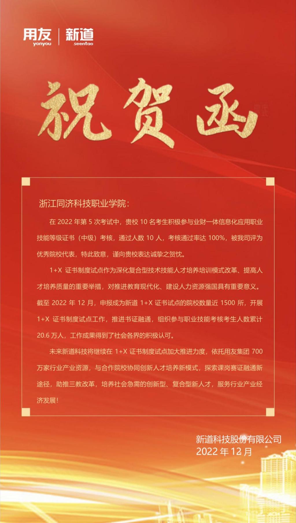 12月3日,我校作为试点院校成功举行“1+X”业财一体信息化应用职业技能等级证书(中级)全国统一考试,由大数据与会计教研室严格按照考试规定组织本次考试,做好组织报名、考前培训、考前设备调试、场地布置等各项工作,确保了此次考试的有序进行。会计专业指导教师张奕畅带领2021级会计专业10名参考学生积极备考1个月,期间邀请行业专家进校给学生现场指导,并组织了3次模拟考试,模拟考试成绩保持稳定上升趋势,最终以最高分96分(满分100分)和100%通过率为此次考试画上圆满的句号。因成绩突出,被新道科技股份有限公司评为优秀院校代表。