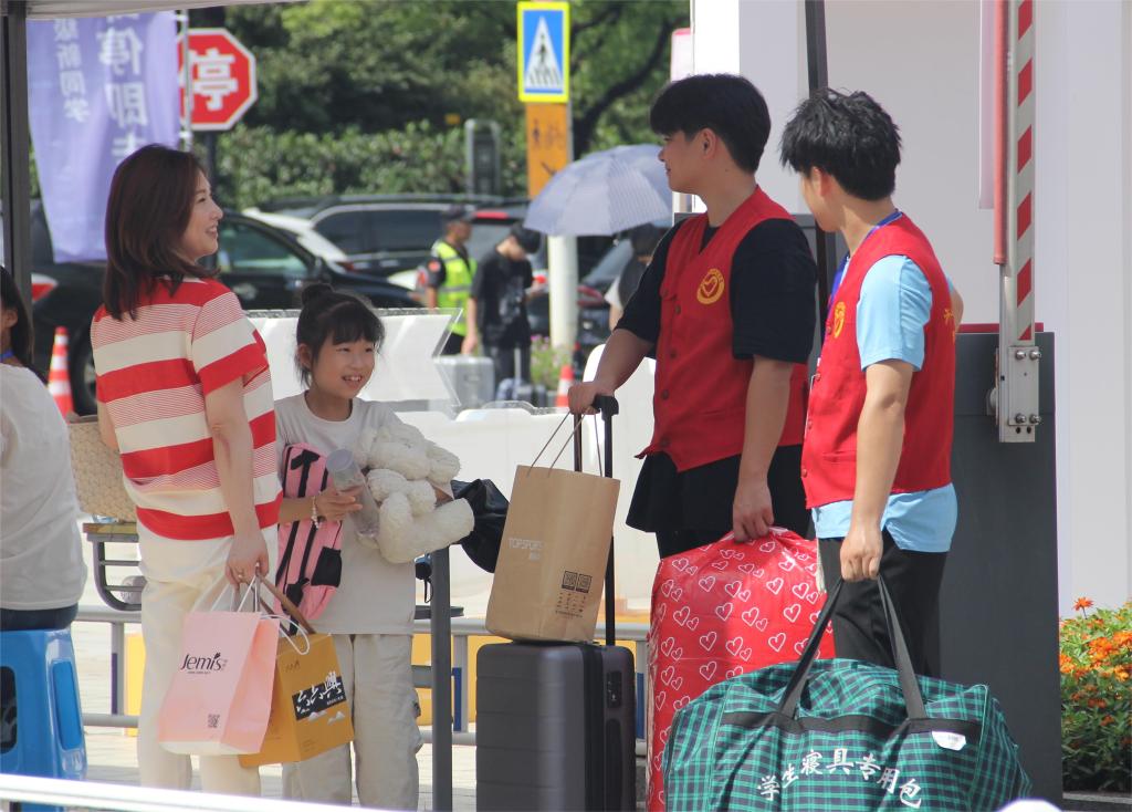 迎新现场,辅导员、班主任全天在报到台迎接新生,党、团员师生迎新志愿者队伍充分发挥先锋模范作用,协助做好校门入口新生接待服务工作,师生志愿者陪伴报到、搬运行李、耐心解答、保障后勤,简约高效的流程和贴心周到的服务赢得新生和家长一致好评。期间,学校还为新生举办了集体生日会,让初来乍到的新生感受到温暖关怀。
