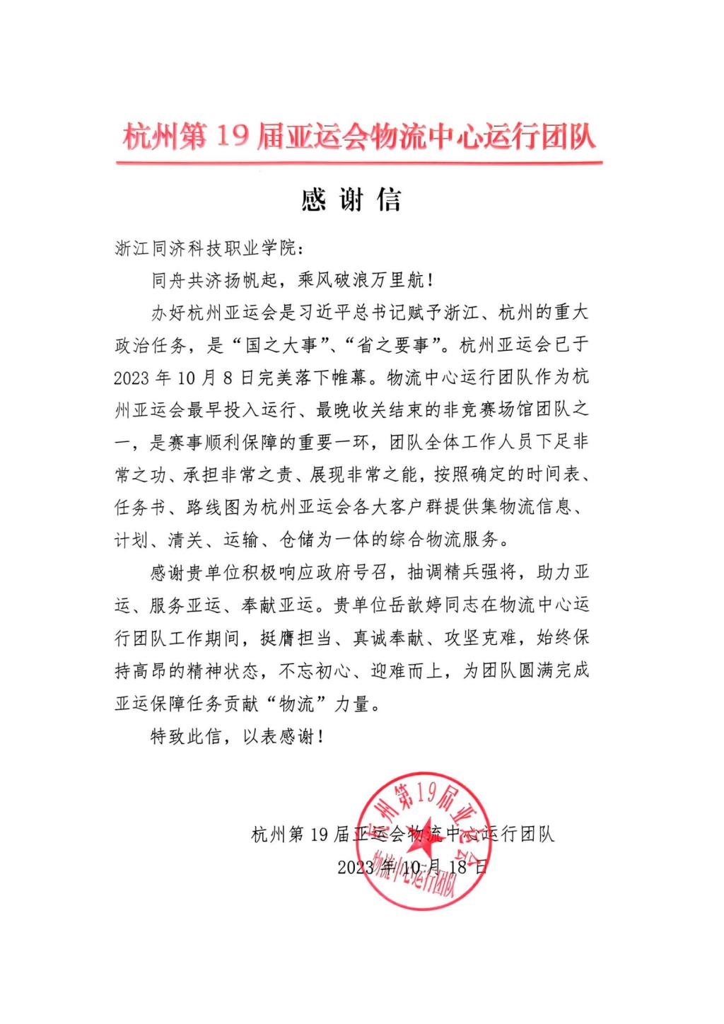 近日,杭州第19届亚运会物流中心运行团队向我校发来感谢信,信中对我校积极响应号召抽调精兵强将支援亚运表示感谢,特别感谢我校教师岳歆婷的辛苦付出。