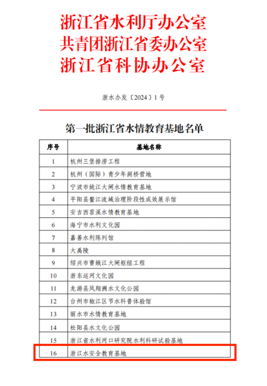 近日,省水利厅办公室、团省委办公室、省科协办公室联合印发通知,我校建设的“浙江水安全教育基地”入选成为第一批浙江省水情教育基地。此次入选不仅是对学校在水安全教育领域的肯定,更是对学校积极承担社会责任的认可。