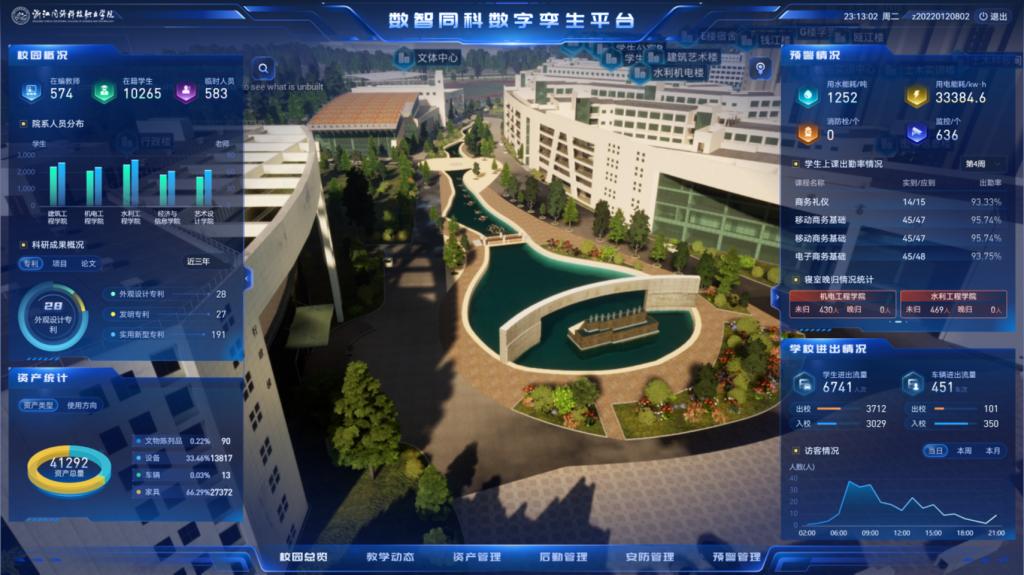 学校在疫情防控期间建成“数智防疫”疫情管控平台,联结闸机等安防硬件和学校大数据中心,对接省大数据平台,联动管理健康码、疫苗接种、人员密接信息等开放数据,根据办事大厅学生请假、教工出省报备等“最多跑一次”业务流程审批结果产生疫情防控黑白名单,技术关联学生健康日报定位打卡出省情况,推出消息预警机制,该平台在学校疫情防控期间发挥了巨大作用,并入选浙江省教育数字化改革典型案例巡展。学校完成“数智同科”数字孪生平台建设,基于数据中台,集成楼宇、资产、监控、消防、能耗、门禁、教室、课表、查寝、考勤、一卡通、科研、实训、网络等业务和数据,以全域高清实景建模为底座,实现3D可视化虚拟现实管理,具备远程指挥、数据展示、状态监测、远程监控、在线巡课、信息预警、轨迹诊断分析等功能,建成学校综合校情、教学动态、资产清查、宿管预警、办学成果和校园文化宣传等领域的典型孪生场景,可以身临其境体验孪生空间的漫游。