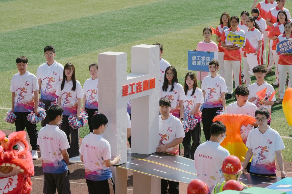 随着慷慨激昂的运动员进行曲,国旗方阵、特色方阵和各学院师生运动员方阵依次入场。水利学院以“水润赛场,‘利’展锋芒”为主题,结合龙年主题元素,以舞龙配合汉服传统舞蹈的表演形式,展现全院师生弘扬中华传统文化,献礼新中国成立75周年的蓬勃热情;建工学院以“建设伟大祖国,走向民族复兴”为主题,通过情景化的施工表演形式,搭建一座充满爱意的“建工连心桥”,展现师生投身民族复兴建设的蓬勃力量;机电学院以太极拳表演形式出场,红伞舞动,呈现出国旗造型,少年们带来青春奋斗主题演讲,彰显爱国情怀与青春活力;经信学院以“清风荷畅”为主题,歌舞表演清新自然,以饱满的热情展现青春的风采;艺设学院用武术与现代舞的碰撞,诠释着艺术的无限可能,彩带迎风扬,恰似惊鸿舞,热血满腔洒,筑起凌云志。