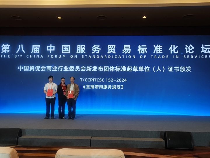 日前,第八届中国服务贸易标准化论坛在北京国家会议中心成功举行。本次论坛聚焦“科技创新赋能服务经济 标准合作促进贸易发展”主题,以标准化推动服务贸易高质量发展。论坛期间向社会公开发布10项标准,由我校作为第一起草单位主持编制的《直播带岗服务规范》全国团体标准入选。