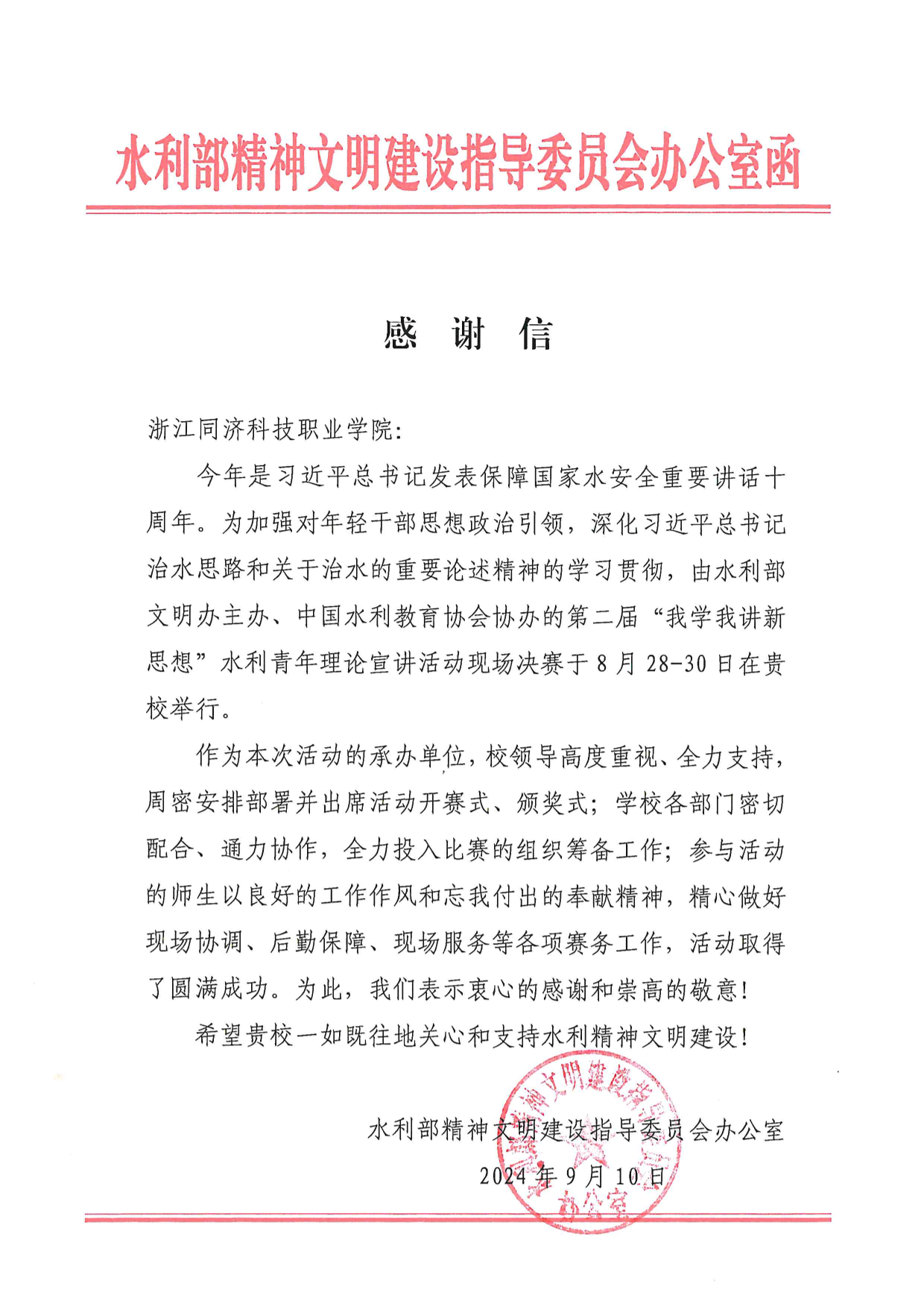 此前,水利部精神文明建设指导委员会办公室向我校发来感谢信,感谢我校承办第二届“我学我讲新思想”水利青年理论宣讲活动现场决赛,并给予学校工作高度肯定。