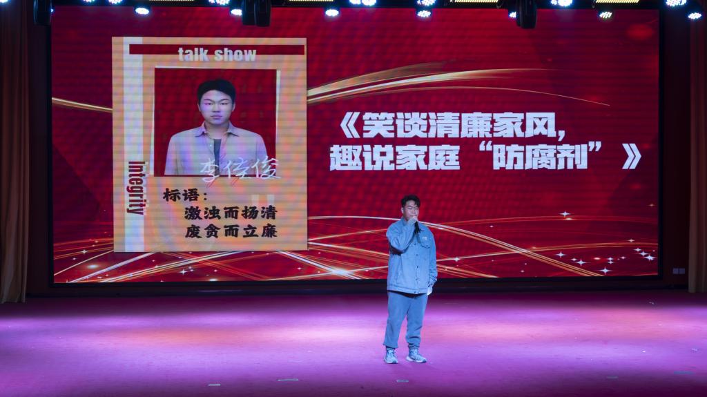本次大赛自启动以来,得到了全校师生的积极响应与广泛参与,经过层层选拔,共有来自不同学院的16名选手脱颖而出,进入决赛阶段。参赛选手们结合校园和家庭生活,围绕学术诚信、学生干部作风、家风家规、行业发展等话题,用诙谐幽默的语言、生动形象的表演,展现了青年学子对廉洁文化的深刻理解和积极倡导,赢得了现场观众的阵阵掌声和好评。