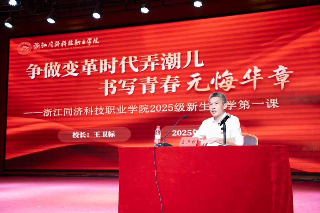 9月15日,校长王卫标以“争做变革时代弄潮儿,书写青春无悔华章”为题,为2025级新生带来了一场立意深远的开学第一课。党委委员、副校长吴敏启主持。全体新生到场聆听,各二级学院党总支负责人、辅导员代表参加。