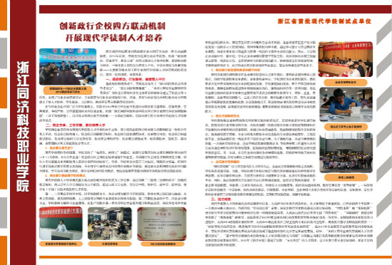 文章从育人平台、培养方式、试点成效三个方面,配以“大禹班”选拔考试、导师聘任、顶岗实习等办学环节的照片,全面报道了我院创新“现代学徒制”人才培养模式的具体做法和成效。我院以“水利综合改革实验班——大禹班”为载体,在水利工程、水利水电建筑工程、水利水电工程管理等水利类专业,积极探索并走出了“现代学徒制”人才培养模式在高等职业教育中的一条特色之路。现代学徒制,通过招生即招工,确定育人“双主体”和学生、学徒“双身份”;实施育人“七共同”,即校企双方共同制定人才培养方案,共同开发工学结合的课程及标准,共同开发理论与技能培训教材,共同组织理论和岗位培训课教学,共同制订学生评价与考核标准,共同做好学校教师与企业导师的“双师”教学与管理,共同做好学生的实训与就业工作,提高学生的专业技术水平和实践操作能力,实现学校与企业的无缝对接、学生与员工的角色统一。