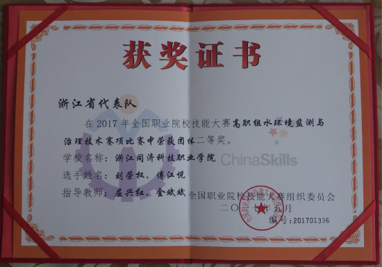 5月12-13日,2017年全国职业院校技能大赛“水环境监测与治理技术”赛事在天津现代职业技术学院举行,来自全国各地的65支参赛代表队参加了决赛。我院学子作为浙江省选拔的4支代表队之一参加了本次比赛,取得了团体二等奖的好成绩,是我院参加全国职业院校技能大赛取得的最好成绩,又是一次里程碑意义的飞跃。