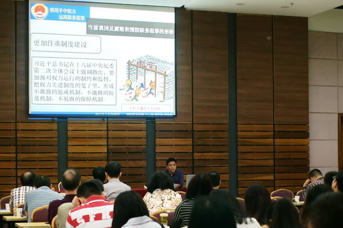 最后,张处长从单位管理和个人自律两个层面入手,提出了预防职务犯罪的有效措施。他认为既要加强对干部的廉政教育、日常监督与提醒,又要加强制度建设与执行,更要每个领导干部时刻牢记自己人性的弱点,守住底线尤其是把牢第一次受贿的底线,拒绝各种利益诱惑。