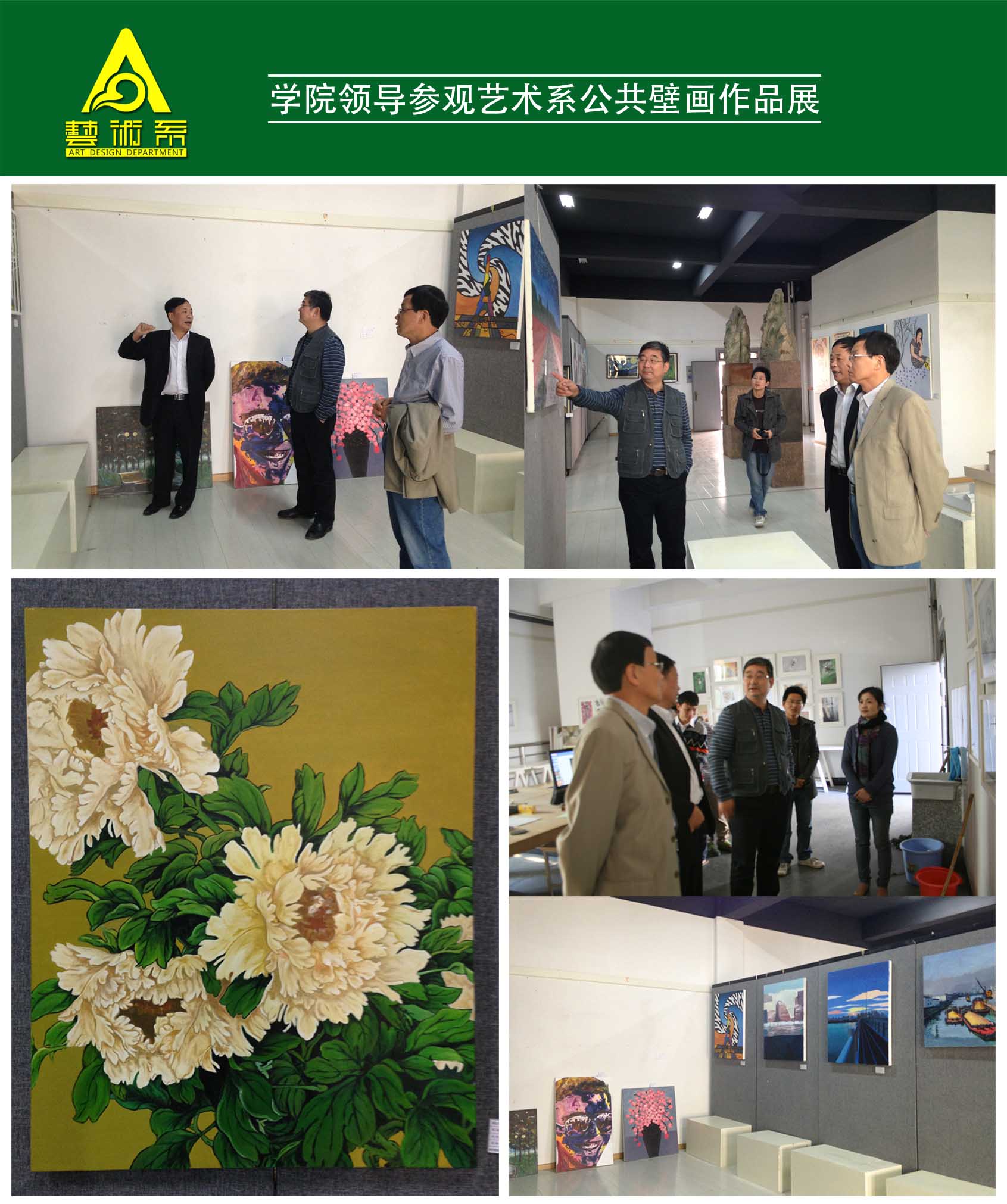 11月5日下午,学院纪委书记葛民江、副院级领导金连根在艺术系主任王光华的陪同下前往艺术实训楼公共展厅,参观了环境艺术设计12级学生公共壁画作品展。两位学院领导对学生壁画作品给予了高度评价,有感而发,对部分作品畅谈了自己的想法以及感受,并鼓励艺术系要多多举办此类艺术展览。王光华主任对公共壁画课程性质、学生作品的制作过程以及陈光龙、卿笑天、梅红霞三位指导教师的悉心指导都一一作了详细的介绍。他们一行还参观了范铮老师的摄影工作室,欣赏了工作室的摄影作品,并对近期艺术系学生在浙江省首届大学生摄影比赛中取得的佳绩表示祝贺。