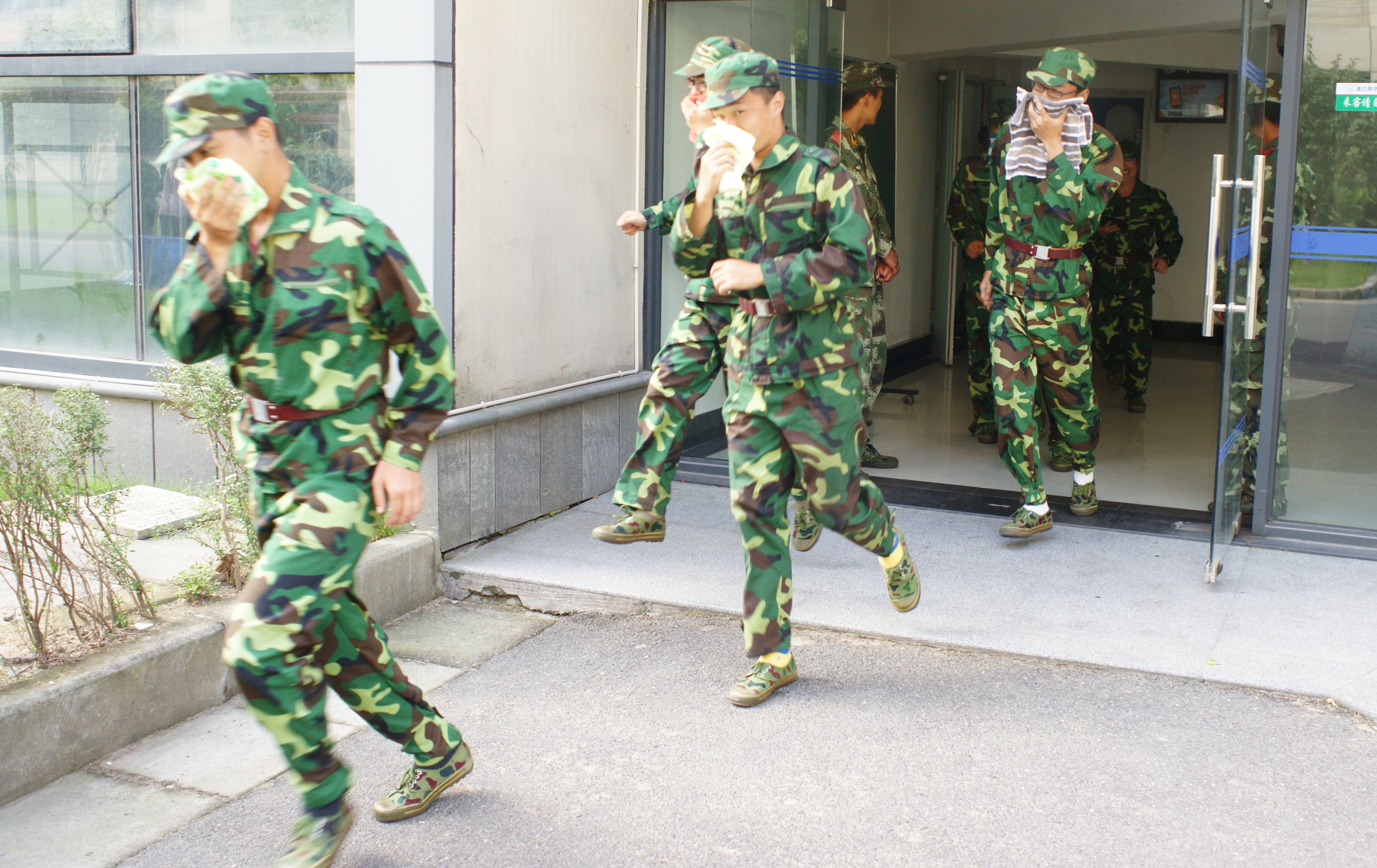 演习在A、B、C三个宿舍楼依次进行,参加的新生达2000余人,在部队教官统一指挥和各楼层引导员带领下,学生有序地手持毛巾或衣物捂住口鼻,沿墙根至消防通道快速撤离,按规定路线到达指定集合地点,整个演习过程紧张而有序。