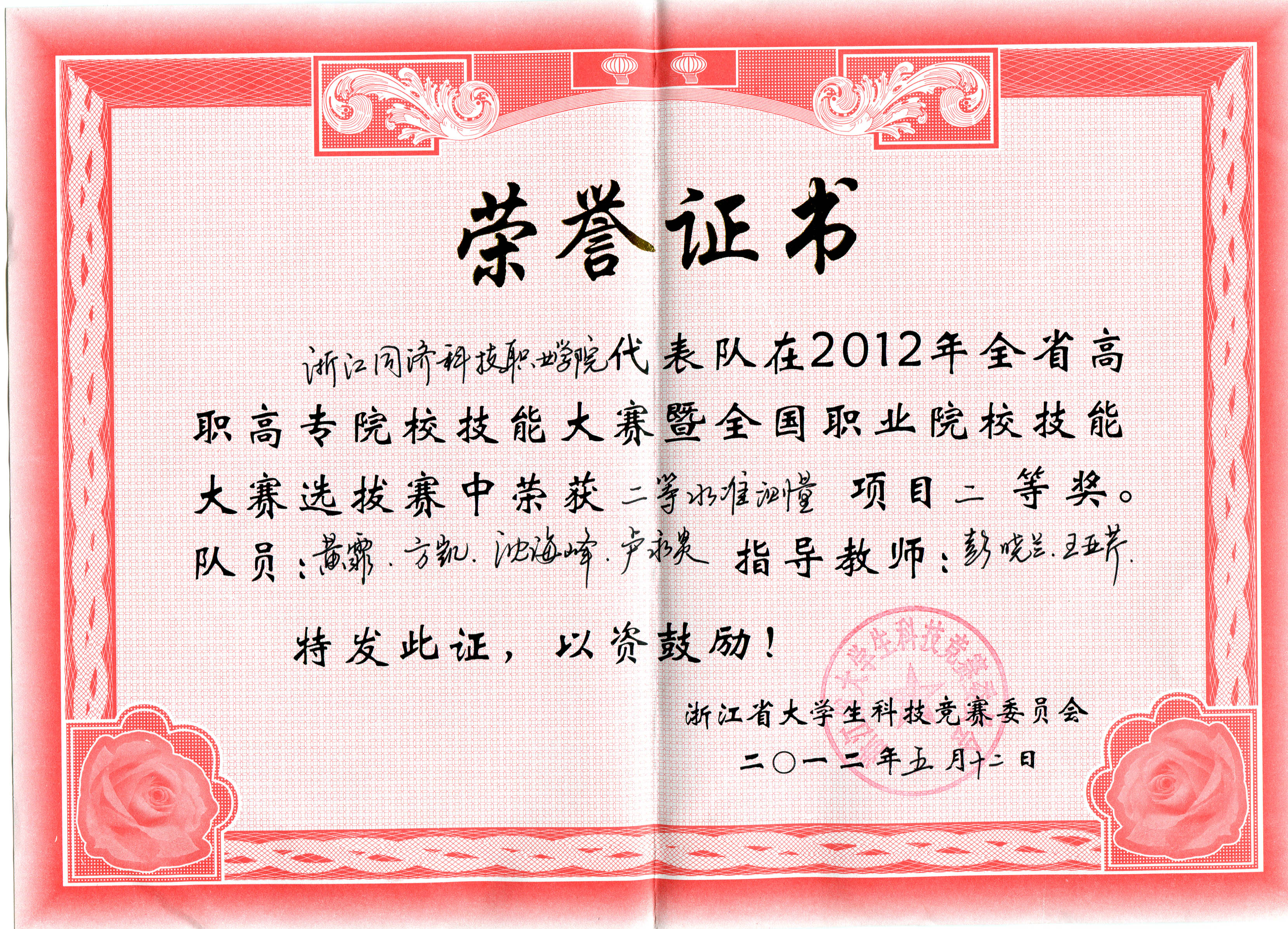 能在本届“2012浙江高职高专院校技能大赛暨全国职业院校技能大赛选拔赛”中获得好成绩,尤其是在缺乏满足竞赛要求仪器的条件下获得如此佳绩,与学院各级领导高度重视,教研室指导老师积极组织选手备战,以及全体参赛选手在短时间内辛勤训练是分不开。