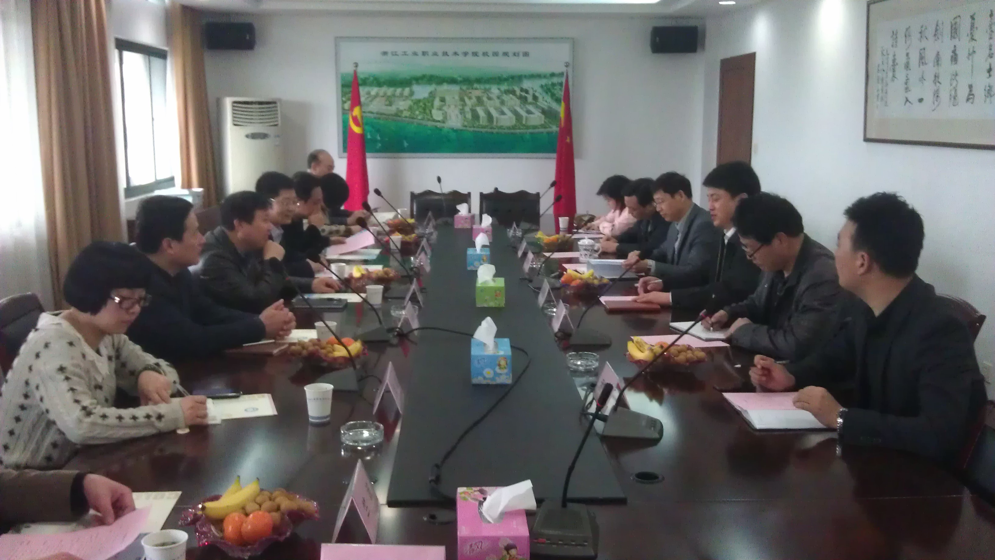 何瑶伟书记详细介绍了浙江工业职业技术学院发展进程、专业建设中取得的成绩和党建工作基本状况,并重点对办学目标、办学定位及坚持为高职培养人才、为社会培训高技能人才、服务地方经济、队伍建设和体制机制改革等方面作了介绍。陈齐苗副院长就落实中央16号文件精神及大学生生活指导和生活教育试点项目,从两家五心(即党员之家、学生之家;公寓中心、办事中心、活动中心、就业中心、心理中心)的平台建设,构建自主管理体系建设、政策制度建设和文化建设等四个方面介绍了学院的建设思路和具体做法。会上,双方进行了深入的交流和探讨。