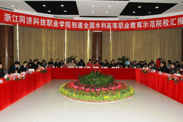 院长叶舟代表学院汇报了学院的基本情况、建设基础和优势、建设目标和内容、保障措施和预期效益。他说,学院以大土木类专业为主体,水利水电、建筑艺术类专业为特色,相关专业协调发展,开设有与现代水利相适应的专业,近几年适逢全国水利事业发展的黄金时期,区位优势和政府部门创造的良好发展环境帮助学院进入了快速发展期,学院于2009年通过的新一轮评估成效显著,实施省教育改革项目不断探索机制创新,校园文化建设取得了丰富的成果,服务区域经济和行业的能力显著加强。叶院长指出,学院将紧贴水利行业,实施“行业、企业、学校”三方联动,搭建三方深度融合的高技能人才培养平台,建立校企合作办学长效机制;以重点专业建设为龙头,创建基于“四大能力平台”课程体系的工学结合人才培养模式,带动其他相关专业发展。把学院建成满足浙江省及长三角地区水利建设高技能人才需求,办学实力坚实、具有浙江特色且全国知名的水利高等职业院校,辐射带动全国水利高等职业教育持续健康发展。