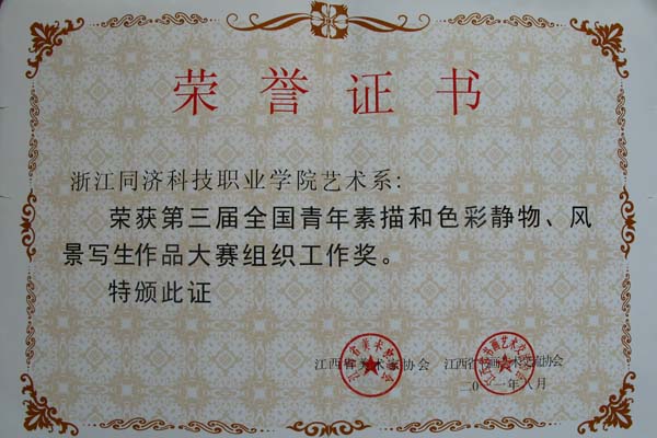 由江西省美术家协会、江西省书画艺术交流协会主办的第三届全国青年素描和色彩静物、风景写生作品大赛评选结果日前揭晓,共评出金奖3名、银奖5名、铜奖12名、优秀奖500余名。参加此次作品大赛者多达5000余人,涉及26个省、自治区、直辖市。浙江省共有70名选手获奖,其中银奖2人,优秀奖68人。我院艺术系学子在此次大赛中取得了优异成绩,共有13名学生的14件作品获得优秀奖,另有52件作品入选大赛。艺术系荣获组织工作奖,卿笑天、张苗、梅红霞和范铮四位老师被评为优秀指导教师。