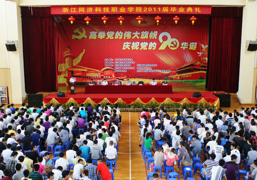 6月24日上午,在学院文体中心举行了2011届高职毕业生毕业典礼。院领导丁坚钢、叶舟、郑贞宝、金连根、吴宏平、郭雪莽、刘志华出席了典礼,典礼由副院长郑贞宝主持,院长叶舟作重要讲话。1589名毕业生、各系领导、毕业班班主任、相关部门负责人出席了典礼。