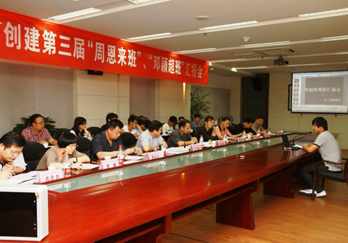 2011年6月14日下午13:30,我院第三届“周恩来班”、“邓颖超班”汇报评审会在行政楼二楼会议室举行。评审会由学院党委书记丁坚钢主持,“周恩来班”、“邓颖超班”创建工作领导小组成员、各系教师代表及学生代表等20人组成评委团对候选班级进行汇报答辩打分,10名候选班级代表参加了汇报答辩。