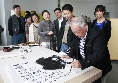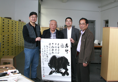 上午10时许,在院长叶舟的陪同下,鲁光老师来到了艺术系。他首先参观了实训室和艺术实训楼,并向周围的老师仔细了解师生创作的油画、素描、雕塑、陶艺等艺术作品,对其中的一些优秀艺术作品给予了充分肯定和中肯的点评。之后,鲁光老师又与艺术系老师进行了座谈,介绍、交流了自己的一些创作体会与感受。最后在老师们的共同要求下,鲁光老师当场挥麾泼墨,为我们艺术系现场创作了一幅《奔牛图》的画和一幅《艺无价》的字,使老师们感受了一次与名家零距离的艺术陶冶。