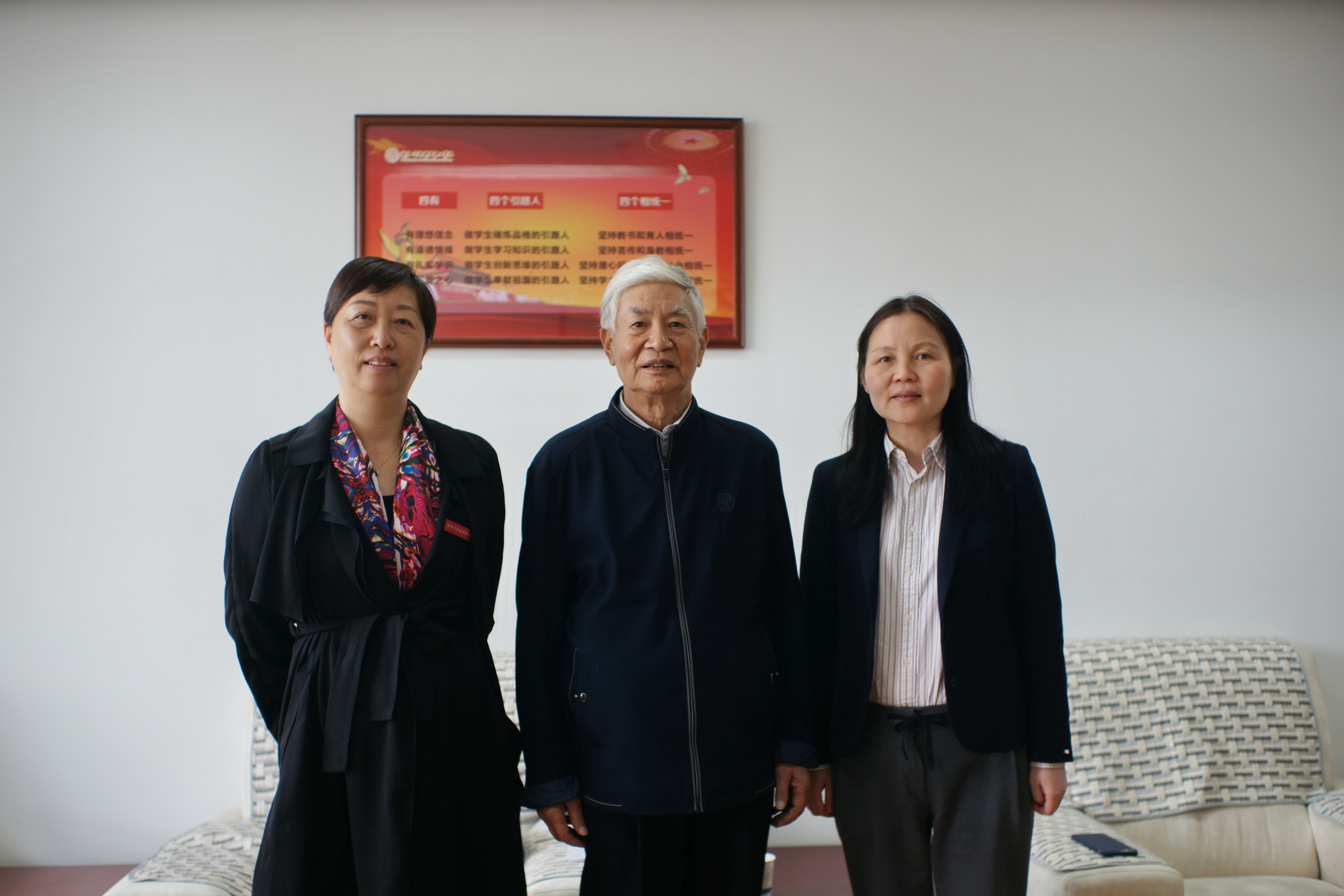 学院党委书记江影(左)、办公室副主任丁黎敏(右)与邵在田老师在习近平总书记“三个四”好老师要求的标语前合影