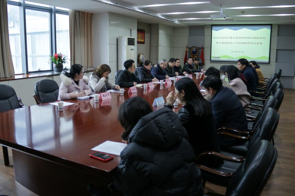 3月5日下午,萧山技师学院徐兴潮副书记、曹飞颖副院长带领学工部、团委、后勤等部门一行十人莅临我院交流考察,朱兆平副校长进行了接待。会同我院招就处、学工部、团委、后勤服务中心进行了会谈,会议由朱校长主持。在交流会议上,朱校长首先介绍了我校整体办学情况,对于《国家职业教育改革实施方案》,技师学院和我院都是机遇期,如何抓住机遇,提升办学综合实力,双方进行了探讨。接下来我院招就处金永琪处长介绍了招生、就业、创新创业等工作,后勤服务中心许小青副主任介绍了我院餐饮、寝室、后勤服务等其他工作,会后各部门还进行了单独沟通交流。