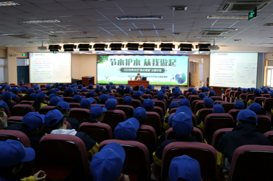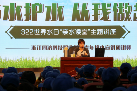 仪式后,学院亲水卫士与200余北干初中的学生开展横幅签名、现场水知识问答,及学院亲水之旅世界水日展览介绍等活动。同学们参与的积极性很高,签名和答题都很踊跃。亲水卫士为他们送上花洒、雨伞、背包、书签等世界水日纪念品,让同学们在娱乐中潜移默化地学到知识。我院首批护水宣讲团讲师张晨辰老师以“节水护水 从我做起”为主题为初二同学作讲座。张老师从浙江水利情况、如何做到节水等多个角度出发,以抛问题送礼物的方式激发学生的积极性,课堂氛围十分热烈。