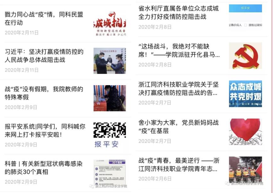 学院官网官微及各部门、系部公众号积极利用微信公众号平台,做好疫情防护的权威信息发布和知识普及,倡议全体师生提高防疫意识,宣传学院在抗“疫”工作中的优秀师生事迹,引导形成积极的舆情导向,凝聚一切力量,共克时艰,抗击疫情。