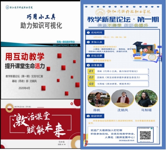 嘉宾分享精彩纷呈。论坛从省级教学比赛获奖教师、校优秀教师、在线教学优秀案例获奖教师中遴选出3名首期分享嘉宾,他们分别总结了线上教学经验,精心准备课件,精彩生动讲解,把线上教学的宝贵经验分享给参会教师。机械与电气工程系蒋帆以《巧用小工具,助力知识可视化》为题,介绍了知识可视化的定义、意义和方法,分享了使用知识可视化工具提升教学效果的经验。基础教学部沈娟凤分享了《用互动教学提升课堂生命活力》,以互动“都有效吗?如何达到最佳?有何感悟?”三个问题为导引,分享了基于作业的互动教学法,以互动教学引发学生兴趣,激发学生思维,促进学生成长成才。建筑工程系马知瑶《激活课堂,赋能未来》,提出上好一门课要“有态度、有广度、有深度、有梯度、有温度”,通过课堂教学为学生成长增值,为将来工作赋予更多能力。论坛分享过程中,参会教师共聚云端,纷纷点赞,交流沟通、探讨学习的热情高涨。