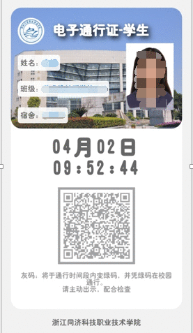 当我院的学生背着重重地行李回到渴望已久的校园,踏进校园的那一刻,每个人的手机上弹出了这条信息,他们青春的脸蛋上洋溢着幸福的微笑。每位同学在返校申请完成后,他的企业微信上就出现了一张专属的电子通行证,这张灰色的电子通行证可是学院防疫工作智慧化的结晶,整合了师生身份信息、杭州健康码、师生返校申请、出门申请等信息。这张“智慧”电子通行证实现了多码联动、自动变色,在同学返校当天,电子通行证变成蓝色,在校门口通道系统经过人脸认证、测温并通过,几秒钟便无感知地完成了报到和通行,走在回寝室的路上,同学的电子通行证已变成了绿色,也收到了学校给成功返校同学的小惊喜。