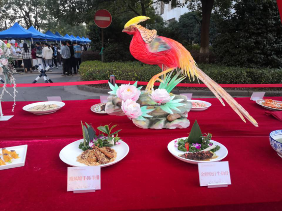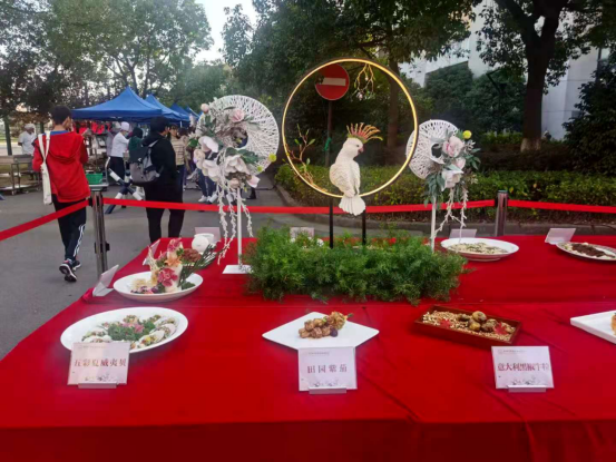 美食日活动是整个美食文化节的重头戏。今年的菜品展示区,成为师生们争相观摩拍照的打卡点,各餐厅的大厨们在菜品的创新、式样、配色等方面下足了功夫,一道道精美的菜肴,刀工讲究,色香味俱全,师生们叹为观止。各餐厅还用香芋、南瓜、莴笋等食材,精心雕刻了寓意着美好生活栩栩如生的雕刻作品,给美食节增添了一抹亮丽的风景,展示了厨师们精湛厨艺的刀工,获得师生的一致好评。