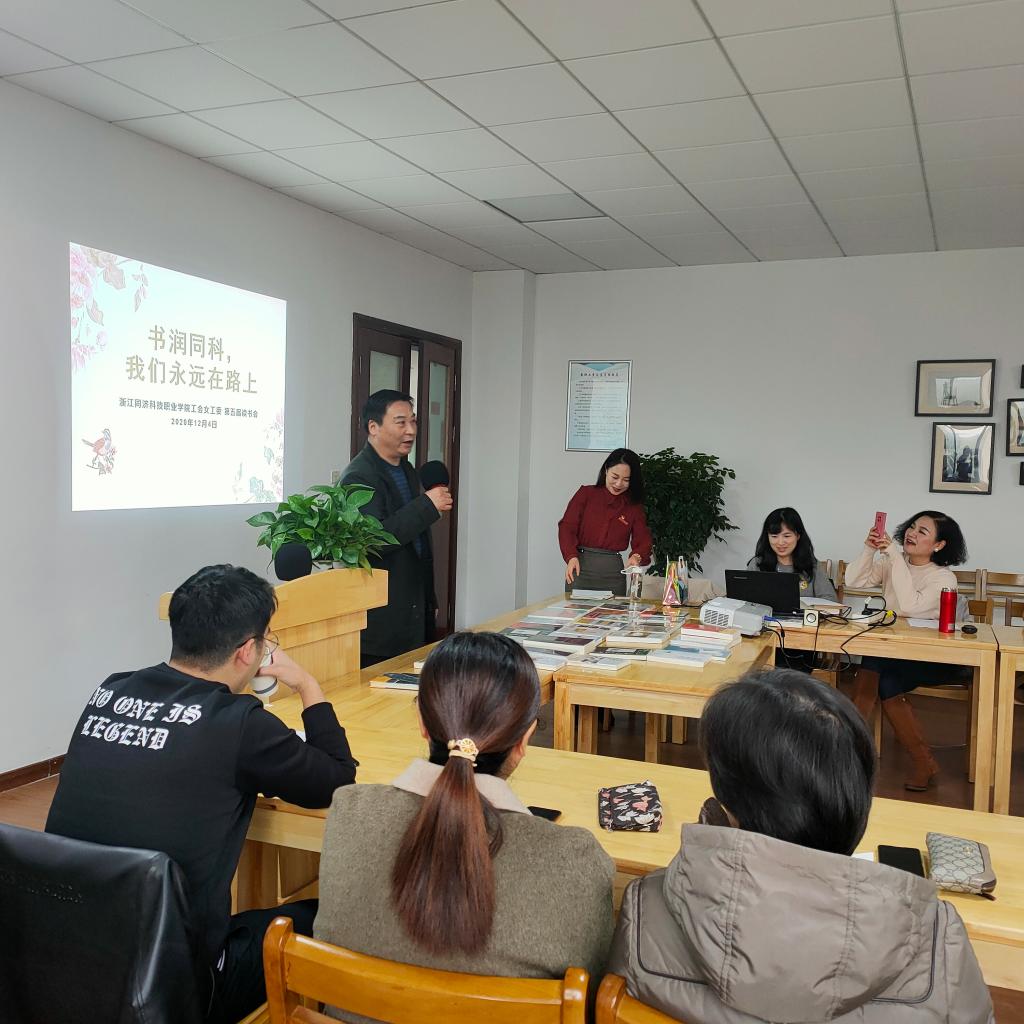 “书润同科”读书活动,旨在引导广大女教职工崇尚学习,树立终身学习的理念,通过读书开阔视野、增长知识、陶冶情操,从优秀作品中汲取养分,发挥女教职工“半边天”作用,为学院的改革建设与发展贡献巾帼力量。来自院办的朱彩云老师首先和大家分享了林语堂先生的《苏东坡传》,她说这本书值得一读再度,合上书之后你会开始思索自己的人生,并从他的事迹中受到可收益一生的启示。艺设系党总支副书记章卉老师,分享了书籍《唤醒生涯》,她从学生家长的角度出发,就学校、老师、家长、社会四方如何联动,形成学生生涯共同体提出了思考。今年新进教师水利系俞暾老师,热爱运动的他和大家分享的是《科比自传》,科比造了无数辉煌的过往,也陪伴了无数球迷的青春岁月,说到动情处,俞暾老师忍不住声音哽咽。工会女工委主任许小青,分享了钱塘江系列丛书中的《淳安千岛湖》这本书,读江水浩荡,观沧海巨变,水利人留下了奋斗的足迹,读来令人心潮澎湃。基础部张盈老师、曹璐老师、艺设系的学生曾楚妍,分别和大家分享了《习近平谈治国理政第三卷》《皮囊》《浮生六记》等积极向上的书籍。整个读书活动温馨美好,给人留下深刻的记忆。