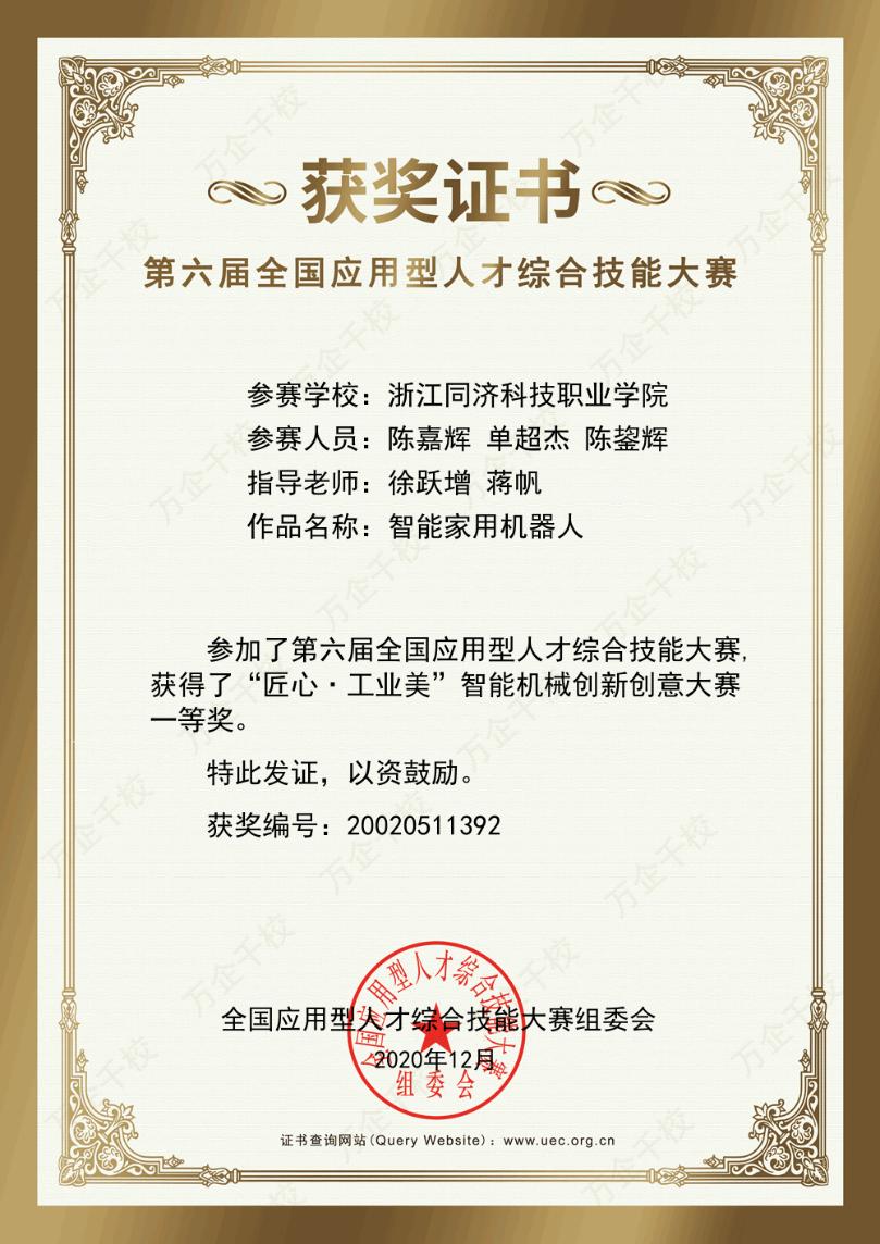 大赛由教育部高校毕业生就业协会主办,高校毕业生就业协会校企合作委员会承办。本届大赛组委会设立“匠心·职场秀”简历精英挑战大赛、“匠心·青春梦”大学生职装创意设计大赛、“匠心·工业美”智能机械创新大赛、“匠心·园丁情”教师创课大赛等四个比赛科目。全国共769所高校,12376支队伍报名参赛。我院机电系一体化技术专业部总结历届竞赛经验,统筹谋划学生竞赛项目,提前组成指导教师团队,发挥社团作用,精心组织学生准备,经过层层选拔推荐,选送“匠心·工业美”智能机械创新大赛4项,经过激烈角逐作品《智能家用机器人》(参赛学生:陈嘉辉单超杰陈鋆辉)《“夕阳伴侣”智能家居看护机器》(参赛学生:丁齐行、郑坤坤、吴海)分别荣获一等奖和二等奖(指导教师团队:徐跃增、蒋帆、丁洁瑾、刘娟、何冀昊)。共有14个作品推荐参加“匠心·职场秀”简历精英挑战大赛,其中王程浩同学《匠心筑梦》获得二等奖,单超杰、蒋应杭、郑坤坤获得三等奖。同时,学院荣获优秀组织奖,蒋帆、丁洁瑾老师获得先进组织个人奖。