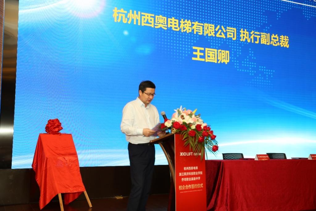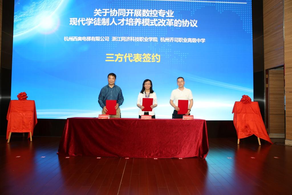 杭州西奥电梯是一家行业领先的现代化综合型电梯企业。从2004年成立至今,每年都保持高速增长,目前已成为中国电梯行业第一民族品牌。乔司职高是一所具有悠久办学历史、在省市职教界都有一定影响的教育局直属公办高中学校,是我校五年一贯制联合培养单位。我校与乔司职高将与西奥电梯协同开展现代学徒制的试点改革,共同创建“西奥五年一贯制现代学徒制试点”班级。