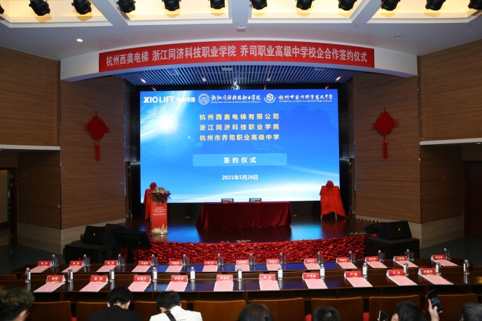 2021年5月26日下午,我校与杭州西奥电梯有限公司、杭州乔司职业高级中学三方校企合作签约揭牌仪式在西奥电梯总部举行。