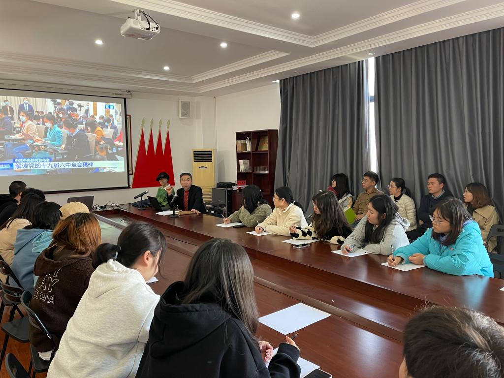 11月8日至11日,中国共产党第十九届中央委员会第六次全体会议在北京召开。艺术设计学院采用跟进学习的方式,在11月12日上午,组织师生在B506会议室收看中国共产党十九届六中全会新闻发布会,学习领会党的十九届六中全会精神。