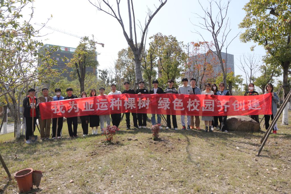 在我国第44个植树节到来之际,为积极推进绿色生态校园建设,学校后勤公司、校团委组织开展了主题为“我为亚运种棵树,绿色校园齐创建”义务植树,30多名师生代表参与了本次活动。