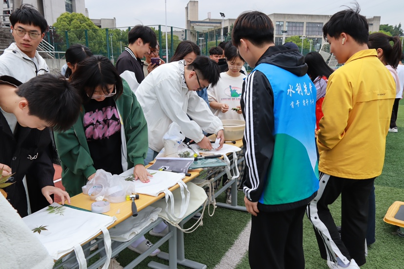 活动现场设置了“水上玩转乒乓球”“丑小鸭赛跑”“两人三足”等项目,同学们踊跃参与。从想办法吹起乒乓球到脚戴气球接力赛跑到两人绑腿合作前行,每个环节的完成都需要个人的坚持与团队的协作。活动过程中,共有8支队伍获胜。通过“心理+运动”,点缀同学们“激昂奋发”的青春色彩。运动之后,获胜的队伍开始制作完成植物拓染。大家奇思妙想,从植物的采摘、浸泡、粘贴、敲打,一步步释放平时的压力与烦闷。通过“心理+手作”,以创作、创新激发出学生们的积极心理体验,让更多的“宅”学生走出网络、走出寝室、走向集体。