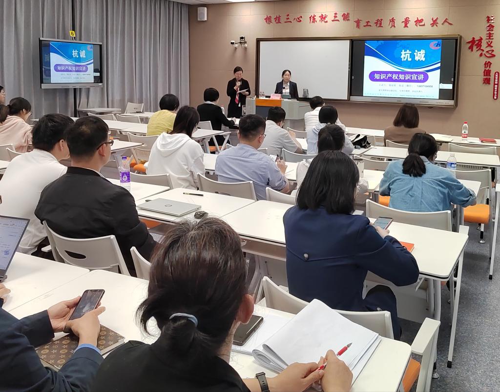 活动期间,邀请了杭州杭诚专利事务所有限公司资深专利代理师郑汝珍律师到学校开展知识产权专题讲座,讲座内容丰富,涉及知识产权种类、专利基础知识、专利审查流程、技术交底书撰写、外观设计及著作权申请、专利非正常申请及科技成果转化方式等,分享了多个科技成果转化案例,为学校科技创新与成果转化工作带来了启发。