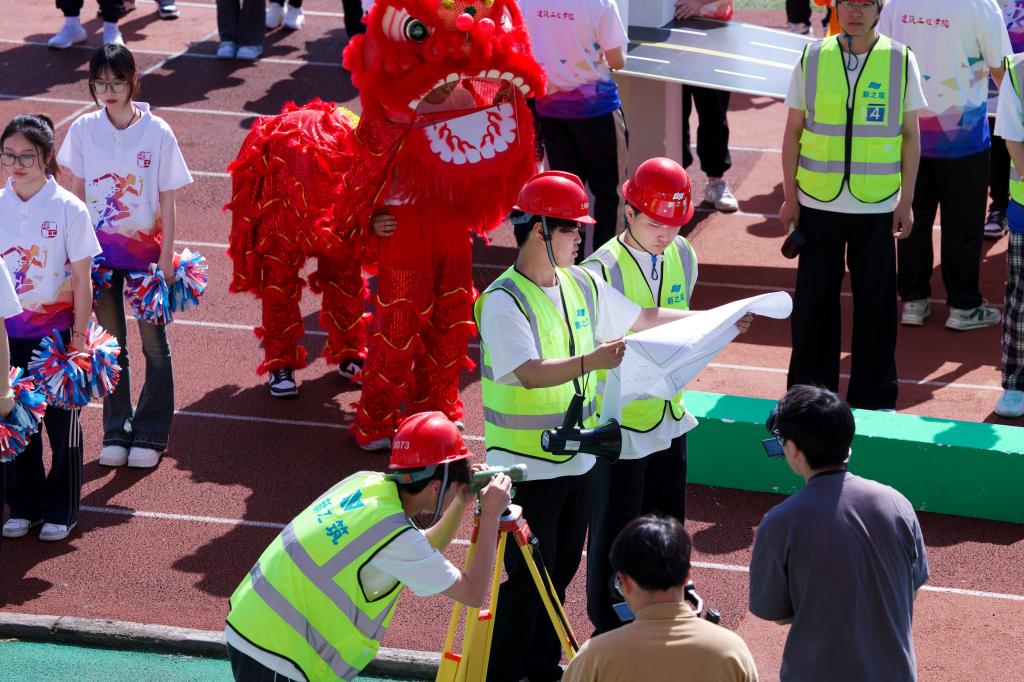 同时,在本次运动会开幕式上,建工学院方阵表演队伍依旧亮点频现。方阵表演以“建设伟大祖国,走向民族复兴”为主题,以土木工程专业背景为依托,通过模拟施工、搭建桥梁等情景化的施工表演形式,来搭建一座充满爱意的“建工连心桥”,生动地展示了建筑工人们辛勤劳作、精益求精的精神风貌,表达着学院师生投身民族复兴建设的蓬勃力量。