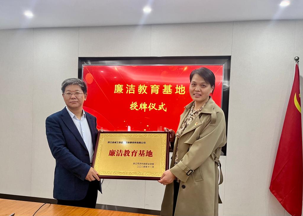 11月15日下午,为加强党风廉政建设、促进校企廉洁文化深入合作,我校与浙江金诚工程造价咨询事务所有限公司在公司总部举行了廉洁教育基地的正式授牌仪式。建工学院党总支书记蒋晓冬,浙江金诚工程造价咨询事务所有限公司总经理蔡红伟、党支部副书记张麟、高工王玲红等一同出席了揭牌仪式。