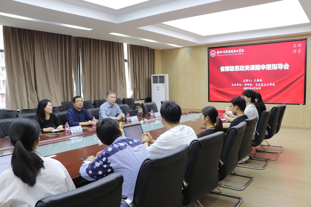 为提升学校教师科研项目申报质量,助力高水平科研成果产出,4月16日下午,马克思主义学院联合校科研处成功举办了省部级思政类课题申报指导会。会议邀请了杭州电子科技大学马克思主义学院院长王海稳教授进行现场指导。学校党委委员、副校长吴敏启,马院院长阮红芳,科研处副处长郭慧芳,马院全体教师以及学校其他拟申报课题的教师参会,会议由阮红芳主持。