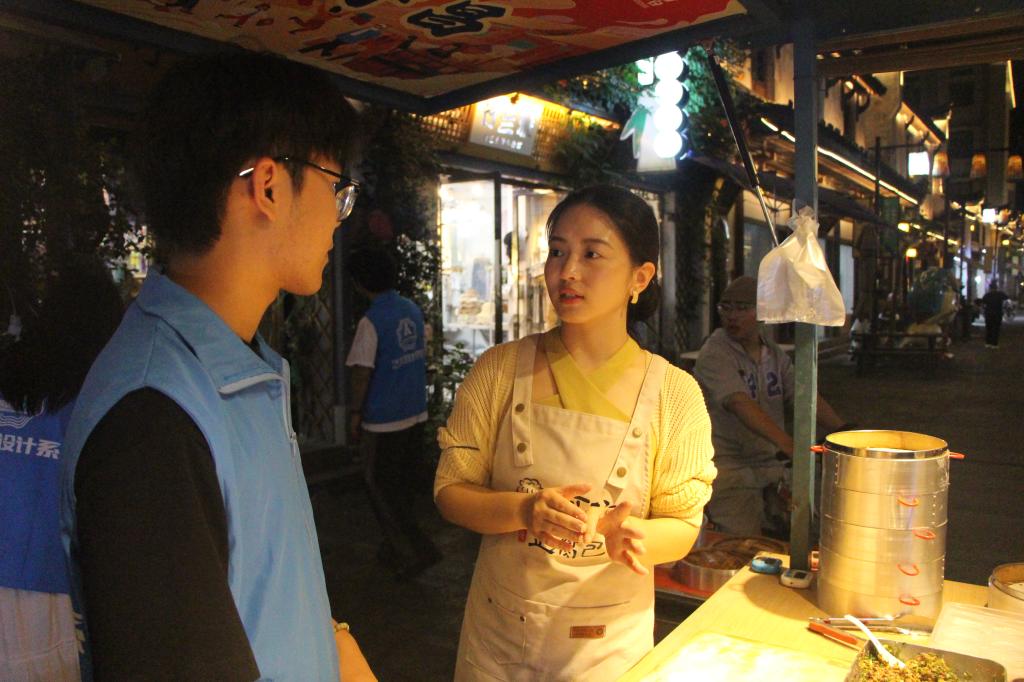 晚间,实践团采访了寿昌镇创业家詹润。詹润向同学们分享,初到寿昌时,她便被这片土地的活力与机遇所吸引。面对就业市场的竞争,她选择了一条不同寻常的道路——将建德豆腐包这一地方特色美食作为创业起点。詹润表示,美食是文化的传承与情感的联结,她希望通过自己的努力,将这份美味传递给更多人。在创业过程中,她不断创新,将家乡四川的辣味融入豆腐包,打造出独具特色的口味。同时,她利用互联网平台宣传寿昌的特色美食和文化,为当地经济发展注入了新的活力。詹润的故事激励着更多年轻人勇敢走出城市,到乡村去寻找属于自己的天地,用知识和技能为乡村振兴贡献力量。